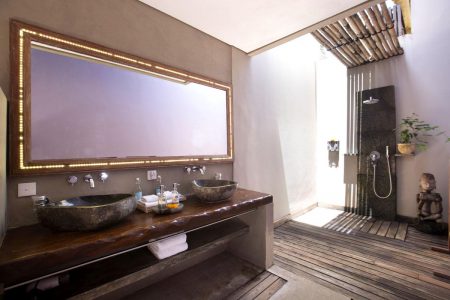 A large semi open air bathroom area, hand shower, head shower, magnifying mirror, bathroom amenities, Bathrobe