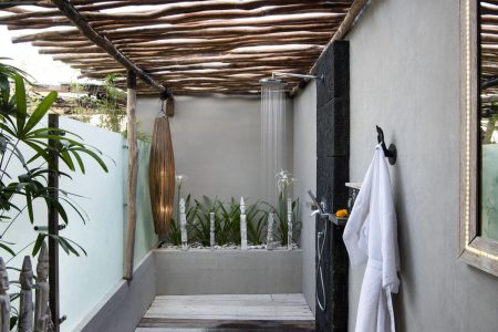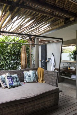 spacilous semi open air bathroom area, semi open air day bed, hand shower, head shower, magnifying mirror, bathroom amenities