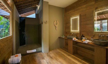 Indoor bathroom area and shower, head shower, magnifying mirror, bathroom amenities, Bathrobe and twin vanity sinks