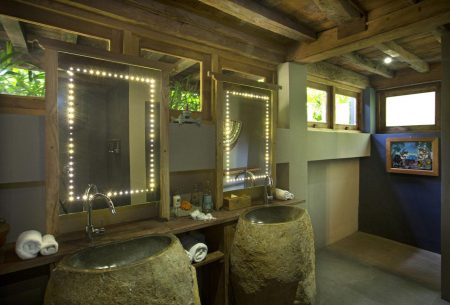Indoor bathroom area and shower, head shower, magnifying mirror, bathroom amenities, Bathrobe and twin vanity sinks